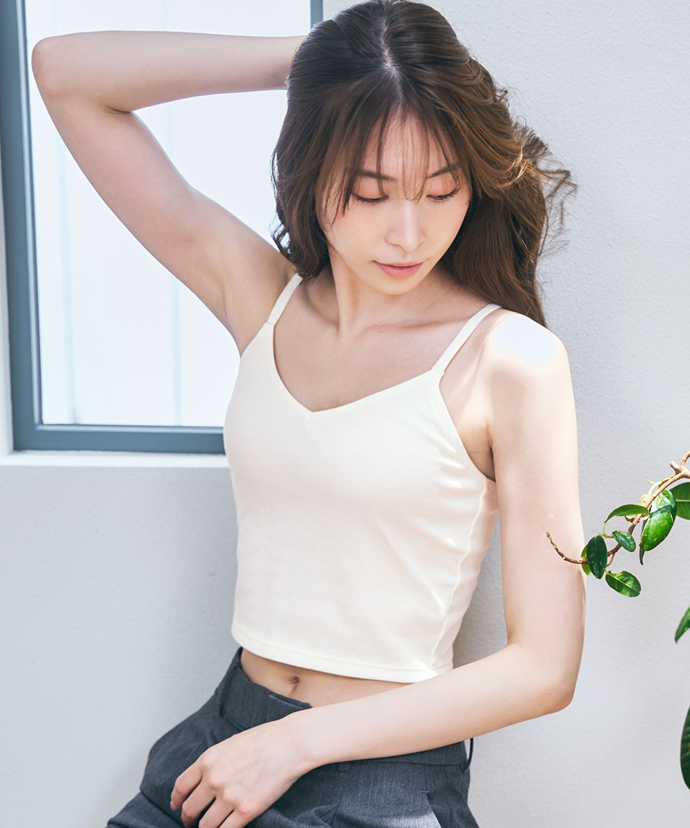 ストラップが調節できる綿混素材のリブ生地だから、肌着がなくてもOK。素肌になじむ、もっちり感がクセになる低反発カップを内臓したキャミブラ。